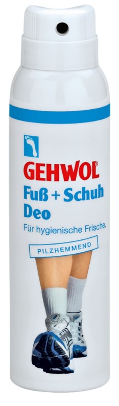 Deodorantul pentru picioare și încălțăminte GEHWOL este destinat îngrijirii zilnice a picioarelor. Este ideal pentru sport și călătorii. Ricinoleatul de zinc previne apariția transpirației și a mirosului neplăcut la nivelul picioarelor și în încălțăminte, eliminându-le eficient. Aroma plăcută oferă încredere. Substanțele active antimicrobiene protejează împotriva infecțiilor fungice în camere de hotel, băi, saune și la probarea încălțămintei. Se poate pulveriza și pe încălțăminte.