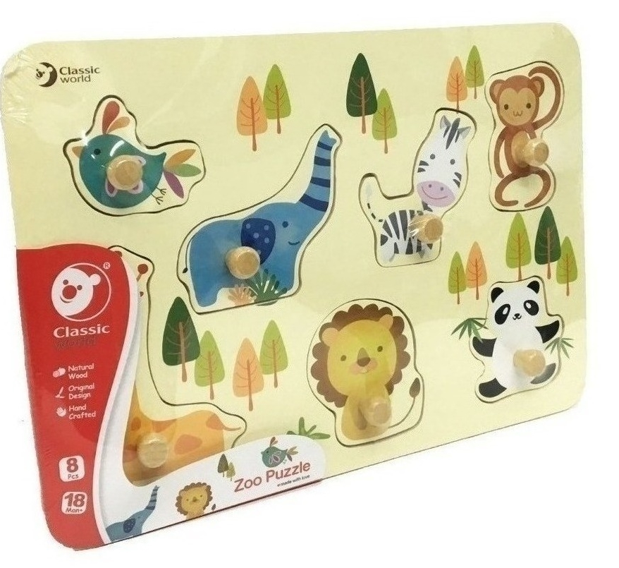 Puzzle de lemn "Zoo” Classic World - este un puzzle tematic. Are știfturi de dimensiuni mari pentru o manevrare ușoară. Copilul va învăța să numească și să identifice obiectele în mișcare pe măsură ce sunt eliminate și le va compara cu imaginile de pe tablă. Jucăria este fabricată din lemn natural, pentru producerea ei se folosesc vopsele sigure.