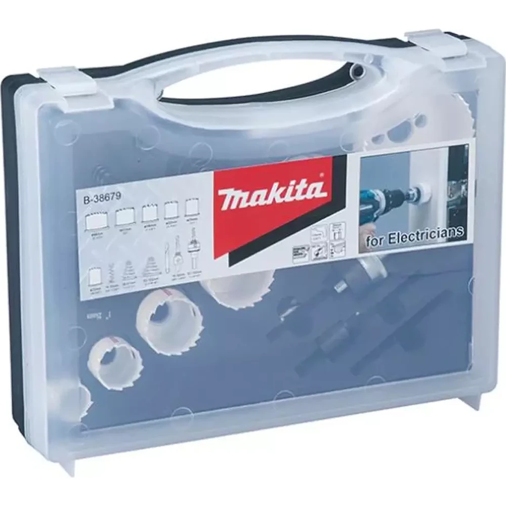 - Набор коронок Makita с биметаллической чашкой включает в себя выталкиватель, который помогает удалять перфорированный материал.