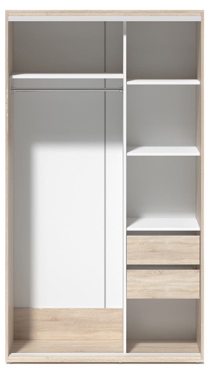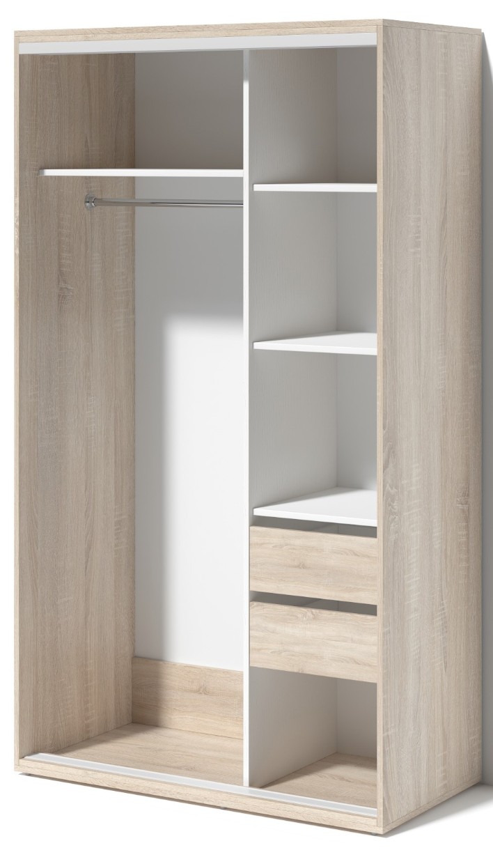 Двухдверный шкаф-купе без труда разместит гардероб вашей семьи. Этот вместительный шкаф имеет штангу для плечиков и полки в которых можно хранить домашний текстиль. Обе раздвижные дверцы зеркальные.