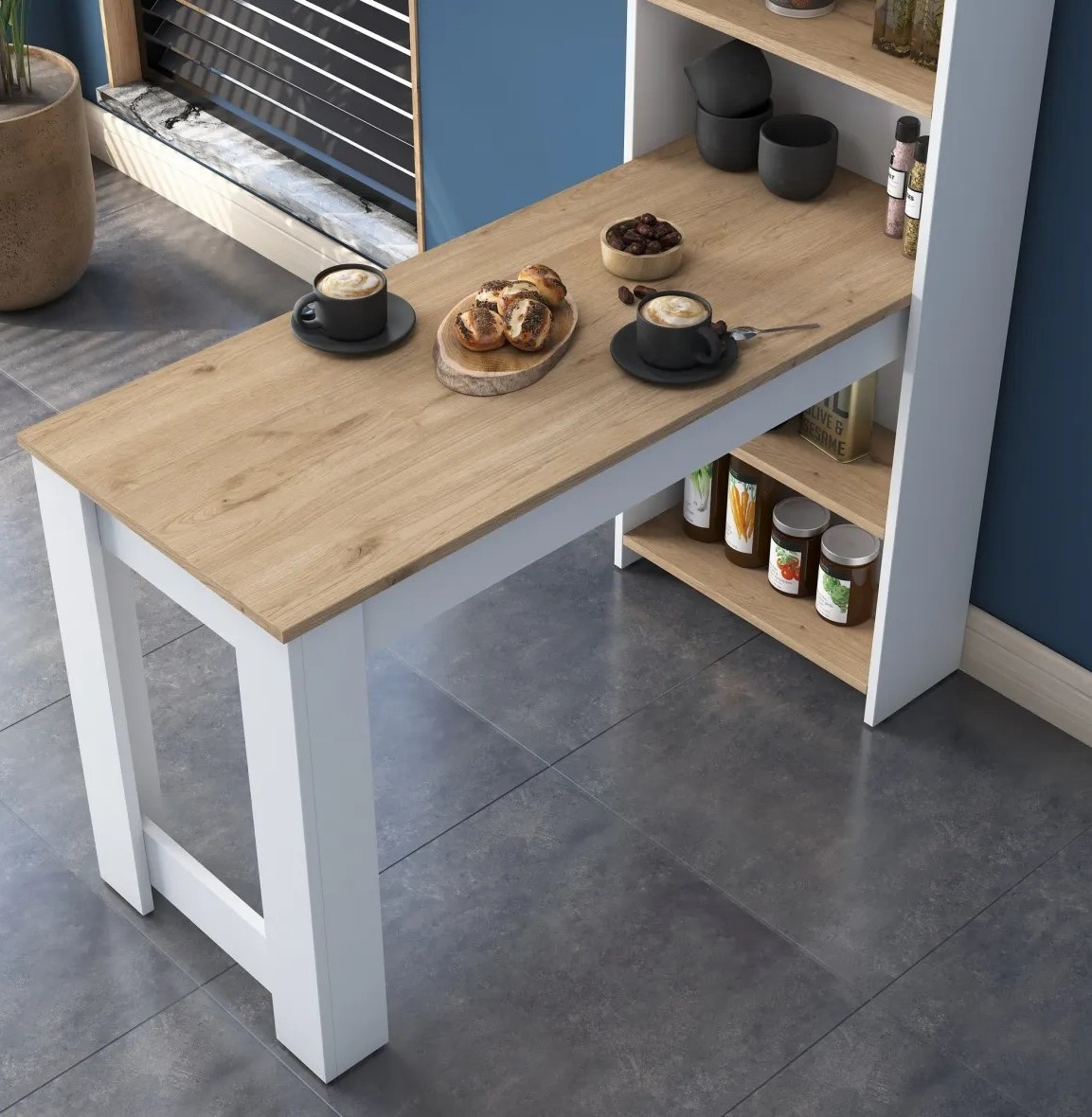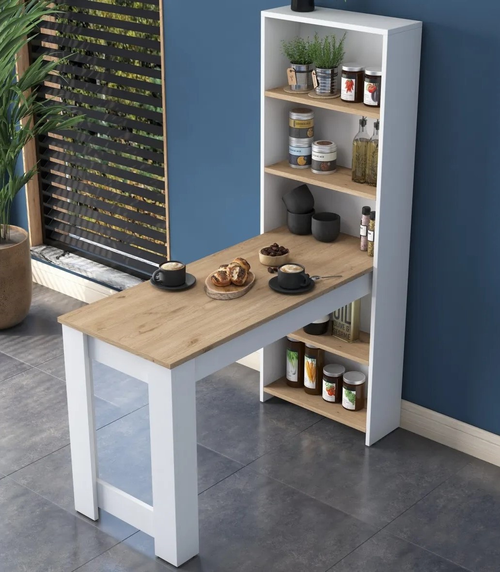 Благодаря множеству полок столешница предлагает удобное и продуманное хранение всех кухонных принадлежностей. От поваренных книг до инструментов — всё будет организовано и всегда под рукой. Конструкция также может быть закреплена на стене для дополнительной устойчивости и спокойствия.