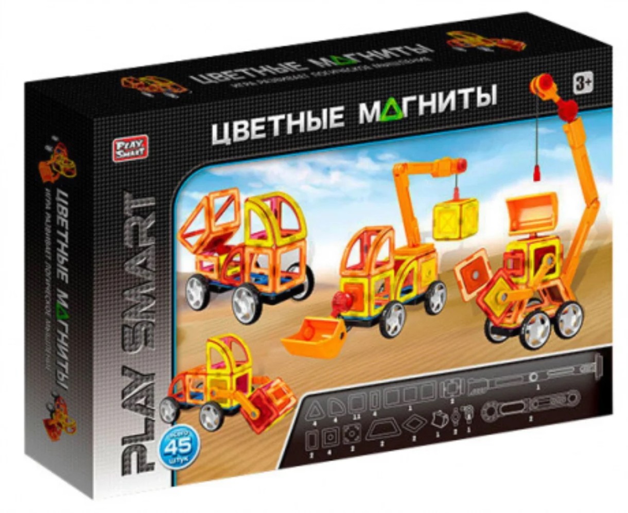 Детали конструктора имеют конфигурацию разных геометрических фигур и разного цвета, цепляются одна за другую благодаря встроенным магнитам. Магниты встроены в корпус деталей, это делает конструктор безопасным для маленьких детей.