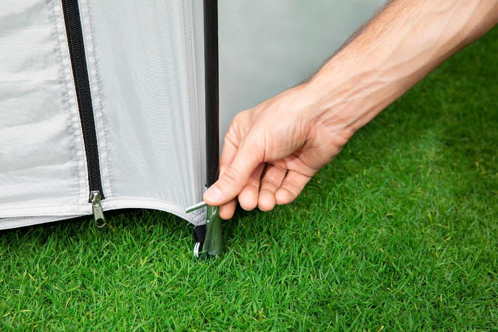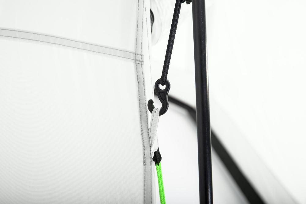 Круглый купол имеет каркас из стекловолокна, два откидывающихся полотна для входа и выхода с противоположных сторон, прозрачные окна из ПВХ на каждой из восьми сторон и крышу из плотного полиэстера, который не промокает, так что дождь Вам тоже не страшен. Крыша и стенки купола крепятся к его каркасу липучками.