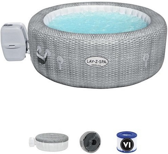 Джакузи надувное Bestway Honolulu AirJet по форме круглый, вместительный, рассчитан на 4-6 человек. Цвет внешних стенок чаши — серый ротанг. Есть мягкий пол, функция аэромассажа, фильтрация воды и водонагреватель. Управление осуществляется с помощью кнопок на панели, размещенной на электрическом насосе. На ЖК-дисплее наглядно отображаются рабочие параметры. С помощью таймера можно задавать удобное время запуска программ. Модель 60019 BW можно использовать как в помещении, так и на улице, благодаря функции, предотвращающей замерзание воды.