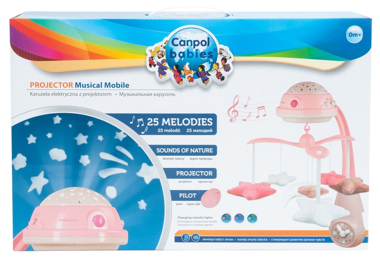 Благодаря множеству функций игрушка положительно влияет на развитие зрительной и слуховой координации ребенка. Проектор отображает разноцветные звездочки и луну. Приятные звуки музыкальной шкатулки и звуки природы помогут ребенку успокоиться и ему уснуть. Карусель имеет на выбор 25 мелодий и звуков.