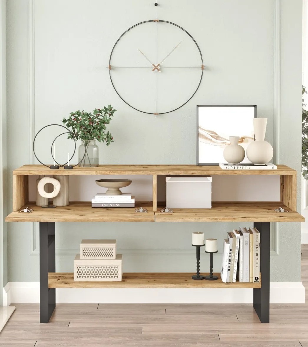 С размерами 138,8 см в ширину, 75,7 см в высоту и 43 см в глубину, консольный столик предлагает достаточно места для хранения без ущерба для стиля. Несколько полок и отделений обеспечивают удобное и организованное размещение вещей.
