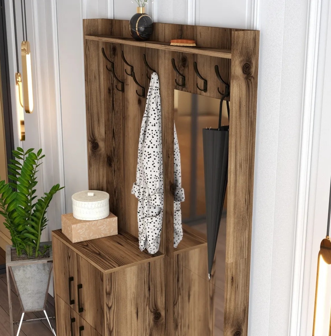 Металлические ножки, ручки и крючки придают стойке индустриальный характер, который подчёркивает стиль любого пространства. Современный внешний вид делает её подходящей для различных интерьерных решений.