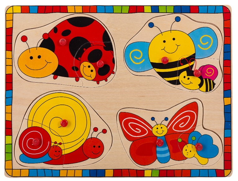 Деревянные детали представлены в виде кусочков пазла разного размера. Вы можете помочь малышу закрепить каждую деталь в предназначенном для нее месте на деревяшке.