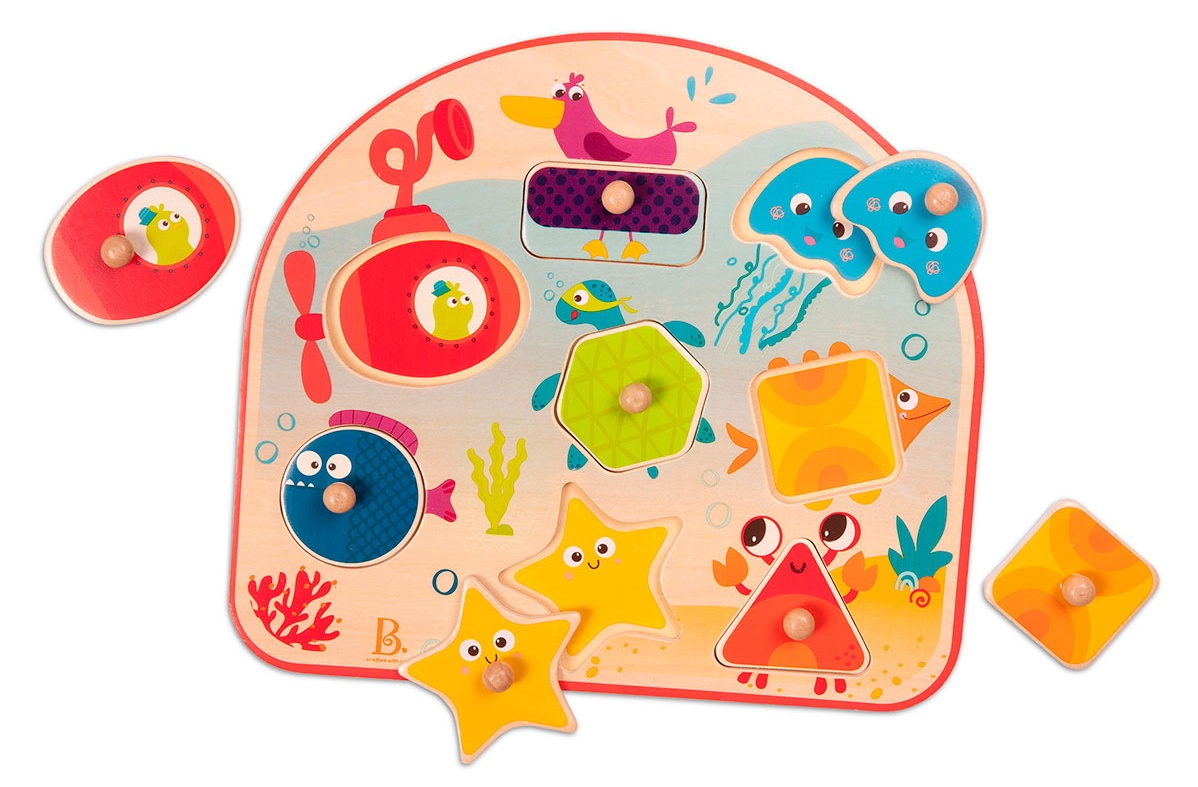 Cделанная из гладкого натурального дерева, эта рамка-вкладыш позволит маленькому исследователю подводного мира погрузиться в глубины морей и узнать больше об их обитателях, таких как медуза, морская черепаха, краб и других. Каждая деталь удобно ложится в маленькую ручку, а цветные иллюстрации на рамке помогут быстрее найти правильное место.