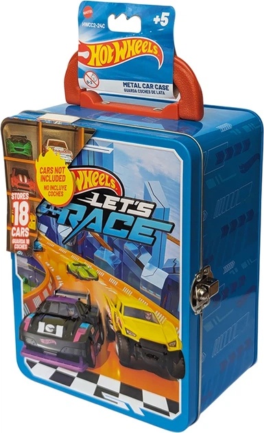 Прочный голубой металлический контейнер вмещает до 18 машинок – отлично подходит как для хранения, так и для транспортировки.