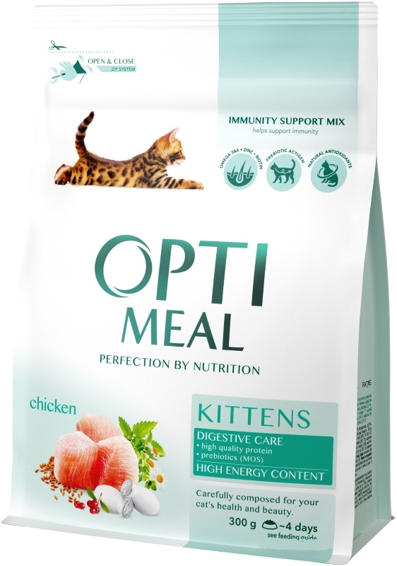 Optimeal для котят с курицей — суперпремиальное питание для котят, изготовленное под контролем ветеринаров. Уникальная рецептура для здоровья и красоты домашнего любимца содержит отборные мясные ингредиенты, полезные травы, ягоды, натуральные антиоксиданты и пребиотики. Все это создает ежедневную естественную защиту иммунитета вашего котенка. Наличие в рецептуре рациона свежего мяса курицы в виде фарша, обеспечат котенка высококачественным легкоусвояемым протеином животного происхождения. Высокое содержание протеина обеспечит повышенную потребность в калориях организма котенка для быстрого роста и активных игр.