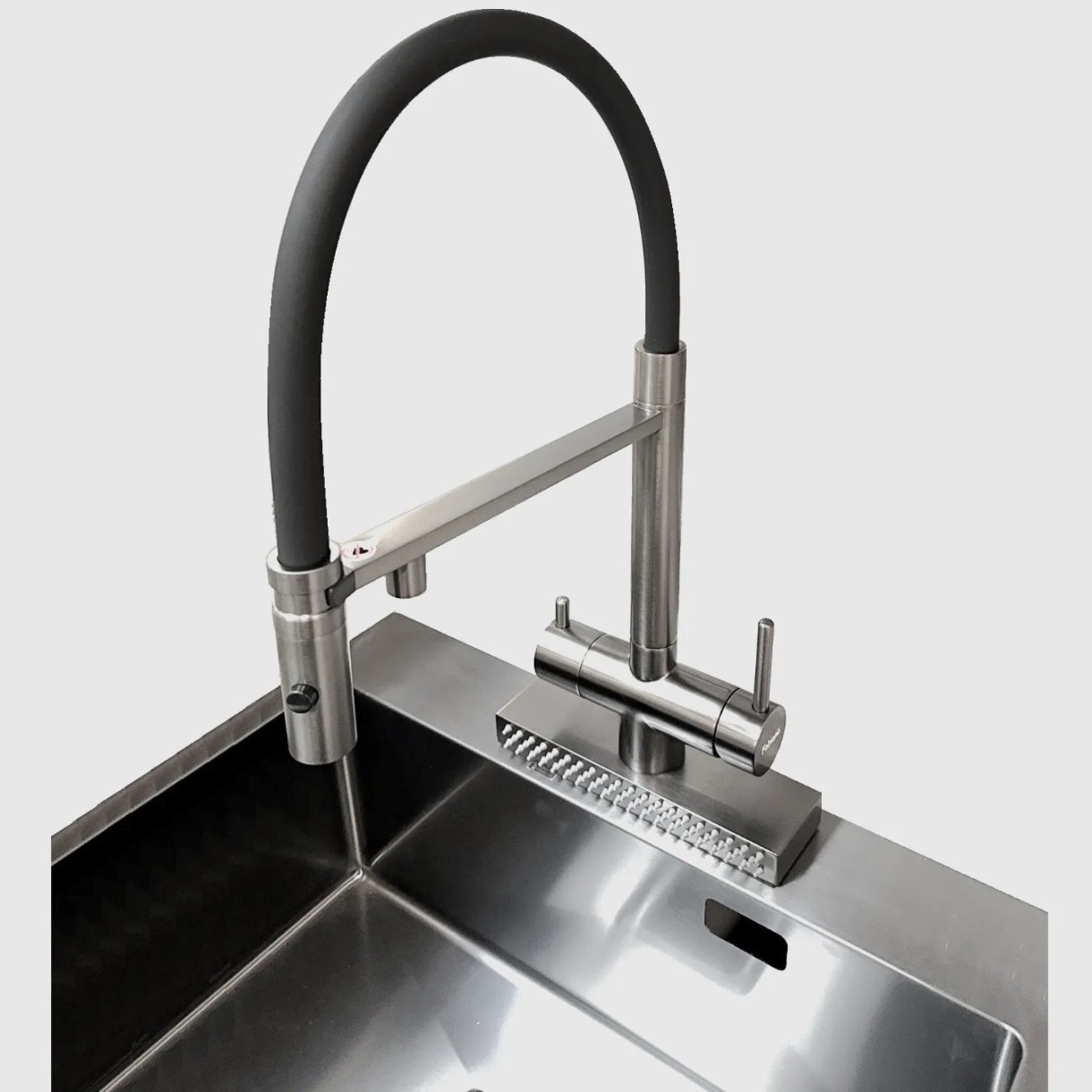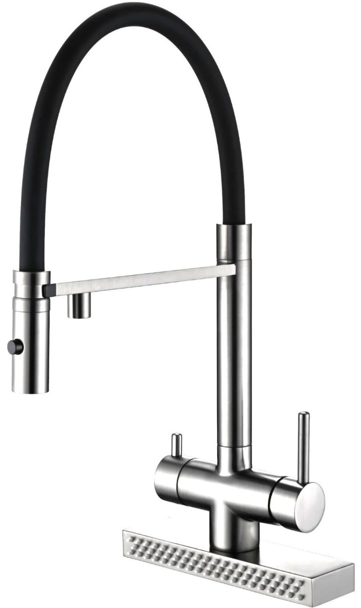 Комбинированный кухонный смеситель Fabiano FKM 3124 (Cascad) с высоким выдвижным изливом в силиконовом чехле. Подключение горячей, холодной воды и очищенной воды из фильтра. Испанский керамический дисковый картридж 25 мм для технической воды. Пластиковый экономичный аэратор NEOPERL. Гибкие шланги 48 см. Излив, поворачивающийся на 360 °, обеспечивает идеальное положение струи воды в раковине. Монтажное отверстие 36 мм.