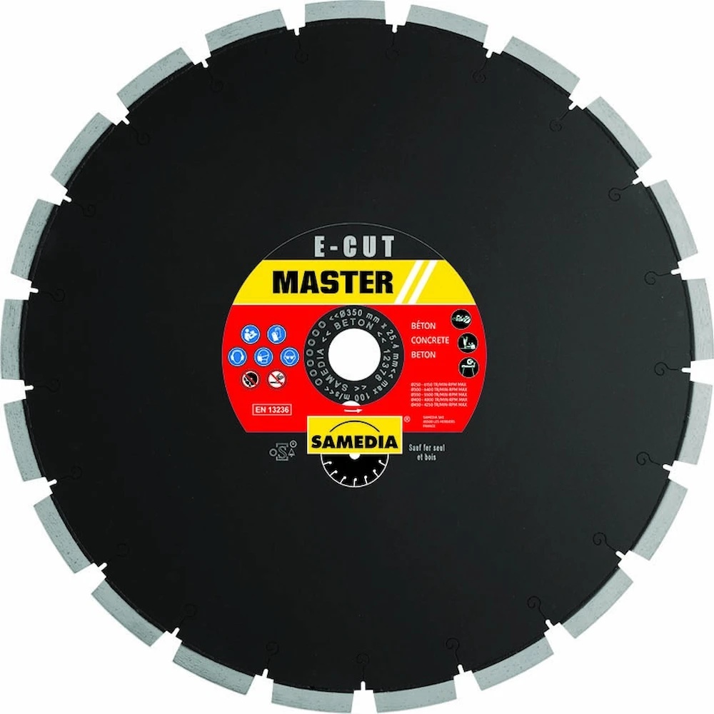 Алмазный диск Samedia MASTER BGM диаметром 350 мм предназначен для профессиональной резки армированного и старого бетона. Изготовлен в Германии, оснащён лазерной сваркой сегментов высотой 13 мм, что обеспечивает высокую производительность и длительный срок службы. Подходит для использования с напольными пилами мощностью до 7,5 кВт.