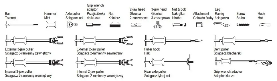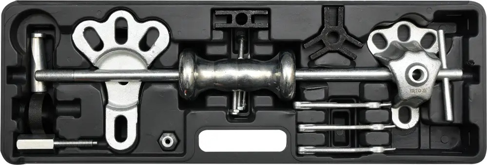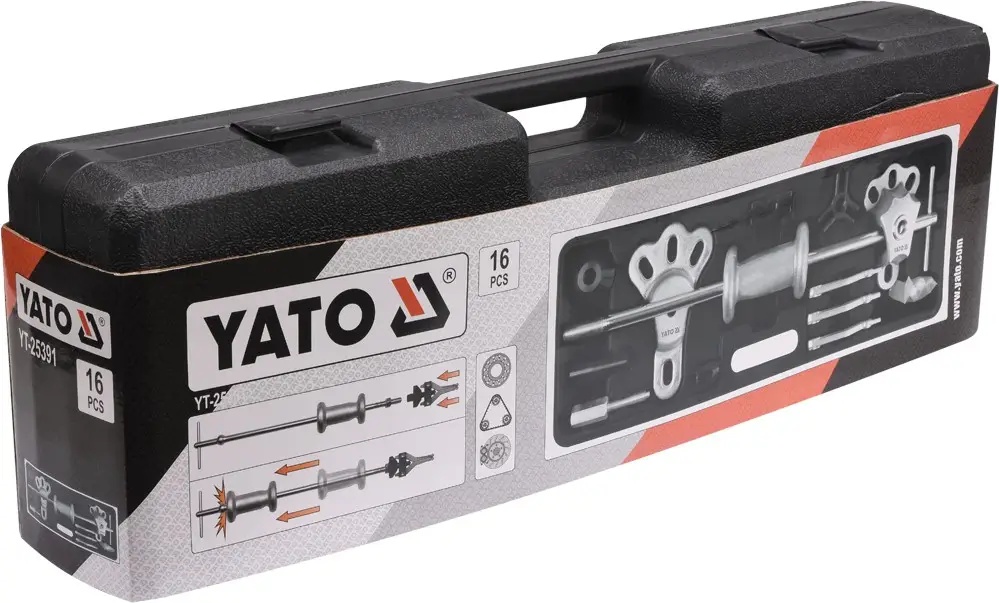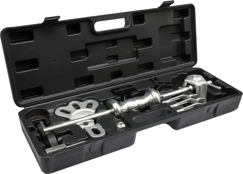 Съемник ступиц и подшипников инерционный YATO YT-25391 поставляется в пластиковом кейсе, в котором для каждого инструмента предусмотрено свое место. В кейсе не только удобно хранить все составляющие набора, но и транспортировать их.