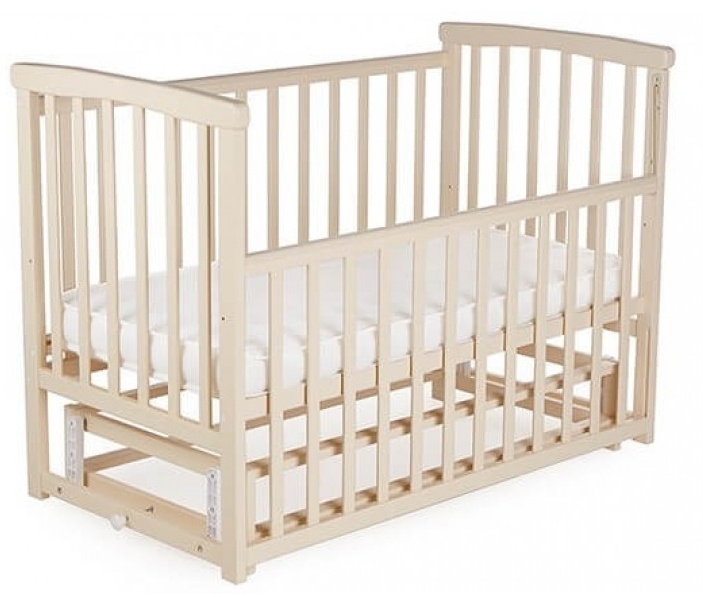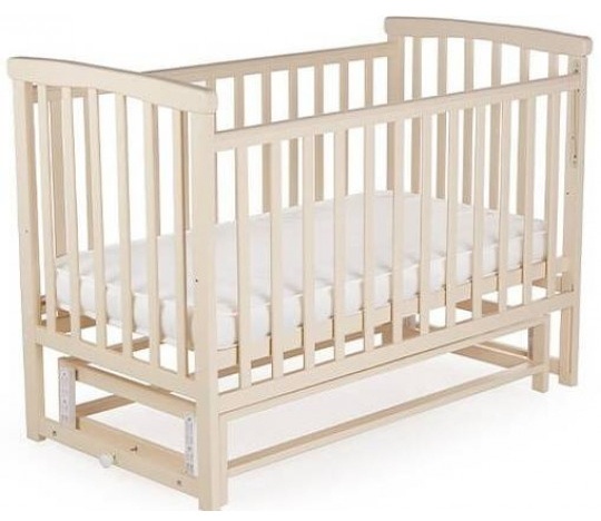 Кровать изготовлена из массива сосны, является экологически чистой, прочной и безопасной для малыша. Она покрыта нетоксичным лаком и краской на водной основе, которые рекомендуется для детской мебели. Кровать имеет два положения регулировки спального места по высоте. Формы деталей закругленные и безопасны. Она оборудована маятниковым механизмом поперечного качания с фиксатором. Кровать без ящика.