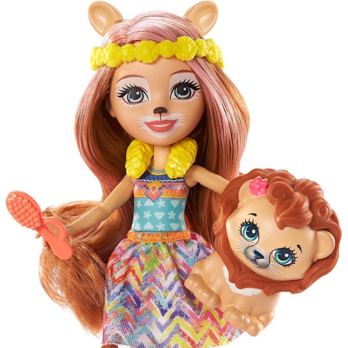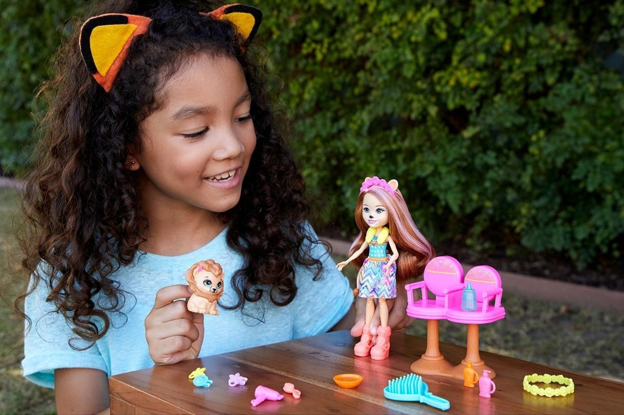 Лучшие друзья Enchantimals, Лейси Лёва и ее друг Манеси любят участвовать в стильных экспериментах! В наборе с куклой и фигуркой питомца есть все, что нужно, для нанесения роскошного макияжа! Лейси одета в радужный наряд, дополненный оранжевыми ботинками и желтым ободком. У куклы есть забавные ушки и хвостик, совсем как у ее обаятельного друга. Усаживайтесь в кресла и скорее начинайте творить! Малышам понравится играть с этой неразлучной парочкой Enchantimals и придумывать веселые истории о их дружбе!