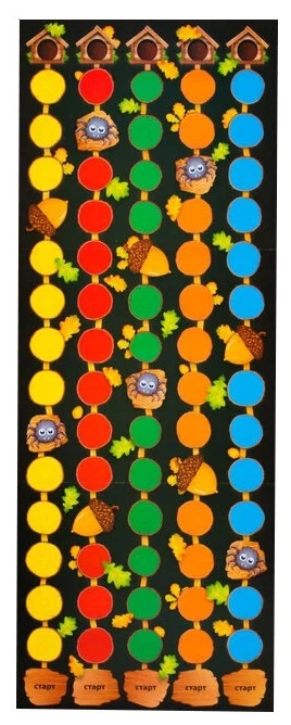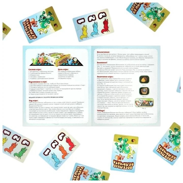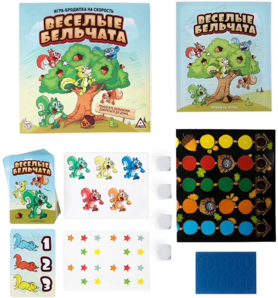 В начале игры участники получают по одной карте, на которой изображено три бельчонка разного цвета, а также указан порядок, в котором они должны дойти до финиша. А удастся ли им добраться до своих домиков в нужном порядке, зависит от вашей тактики, логики и смекалки! Будьте внимательны, ведь каждый игрок будет перемещать бельчат так, как выгодно ему.
