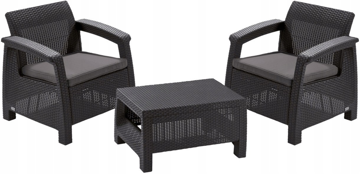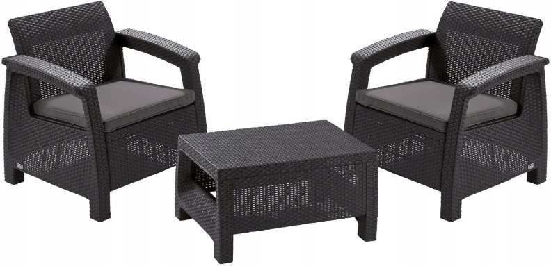 Комплект состоит из двух кресел с мягкими подушками и кофейного столика. Подходит для использования в ресторанах, в офисах, на курортах, зонах отдыха, в гостиницах, а также в коттеджах или загородных домах. Компактный, стильный и легкий садовый комплект мебели Keter Corfu II Weekend Set прекрасно впишется в дизайн приусадебных садов, террас, балконов, жилых зон отдыха, поскольку его компактная форма и оптимальные размеры позволяют оформлять также небольшие террасы и балконы. Легкая, прочная и долговечная мебель из искусственного ротанга с легкостью впишется практически в любой интерьер.