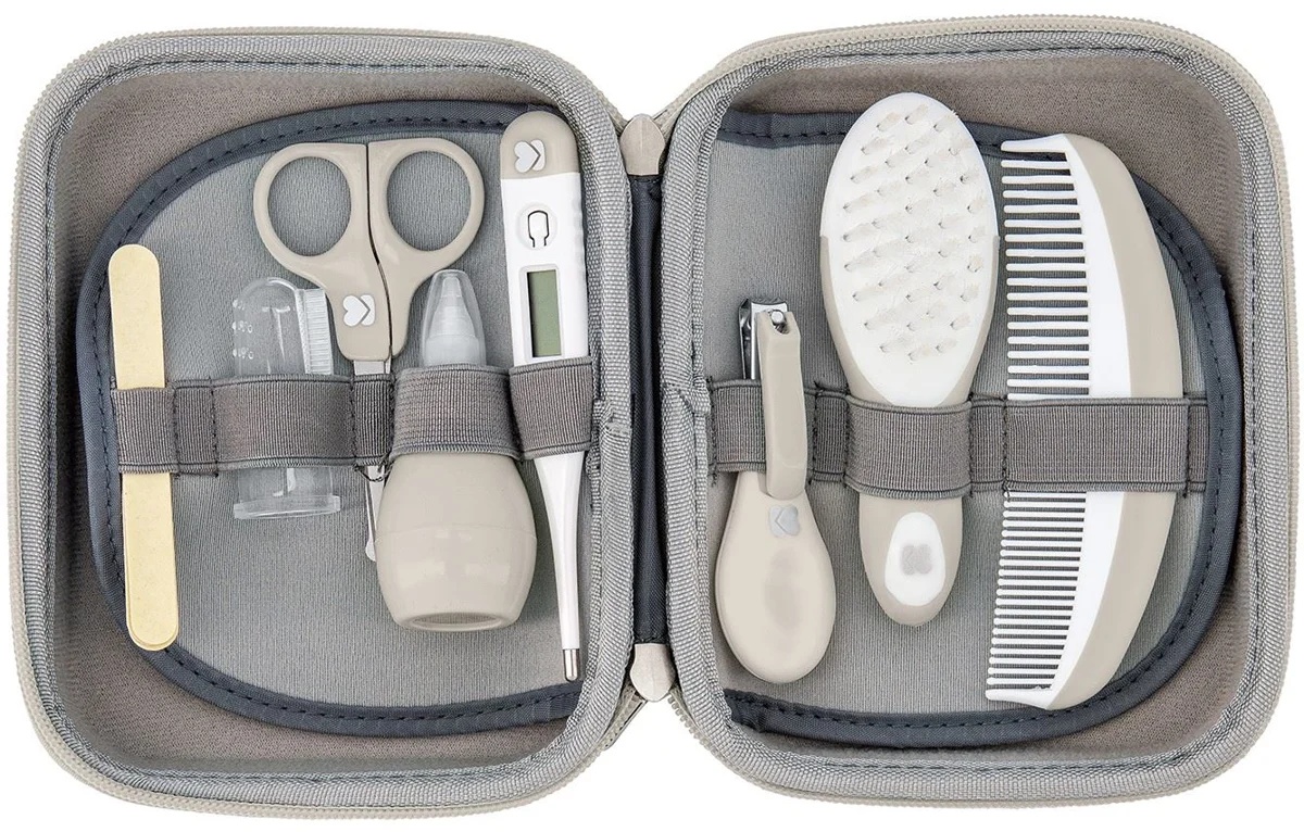 В комплект входят: цифровой термометр, назальный аспиратор, расческа, щетка для волос, массажер для десен, кусачки для ногтей, ножницы и пилочки для ногтей.