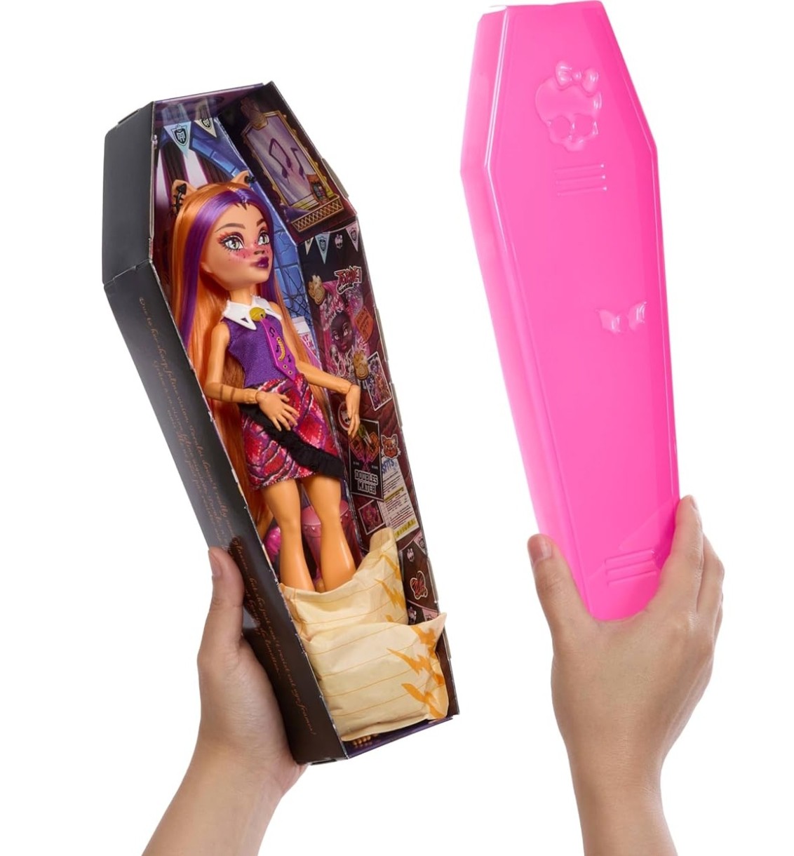 Кукла Monster High Buried Secrets HYV64 - настоящая загадка, позволяющая детям почувствовать себя участником мистического фильма и раскрыть саркофаг. Скорее разворачивай пелены - кто же лежит внутри? Одна из учениц Школы Монстров со своим питомцем и настоящая модница! На каждой кукле яркий наряд, в набор входит набор аксессуаров: обувь, маска для сна и многое другое для разнообразных ролевых игр.