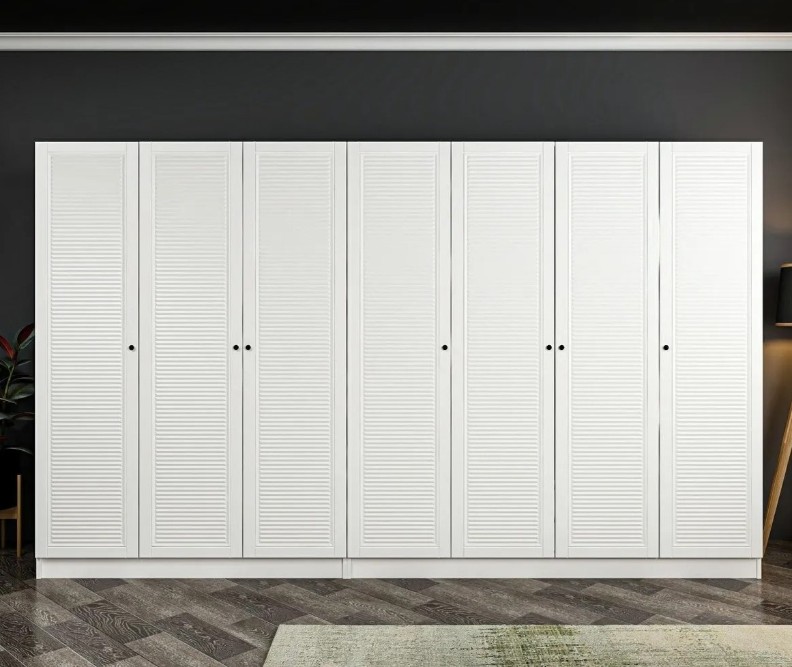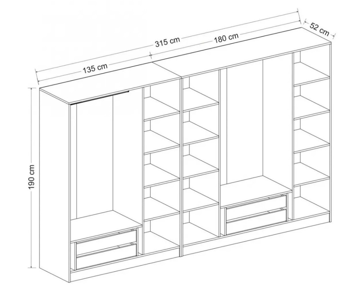 Благодаря размерам 315 см в ширину, 190 см в высоту и 52 см в глубину, шкаф предлагает простор для одежды, обуви и аксессуаров. Многочисленные полки обеспечивают удобную организацию, помогая держать всё на своих местах.