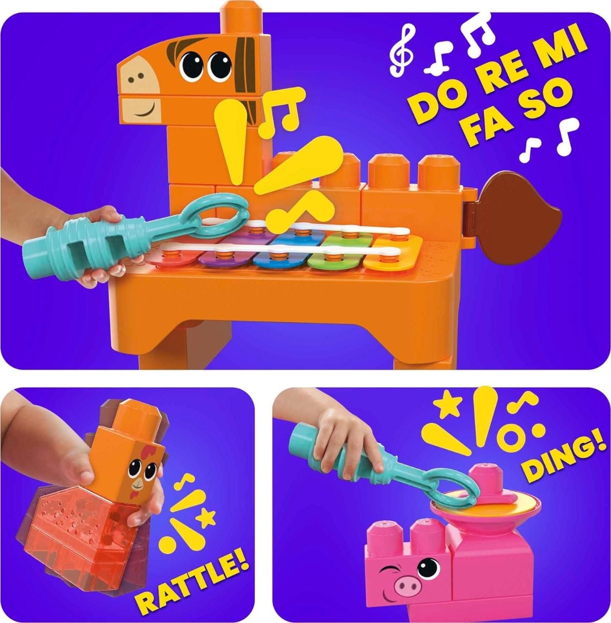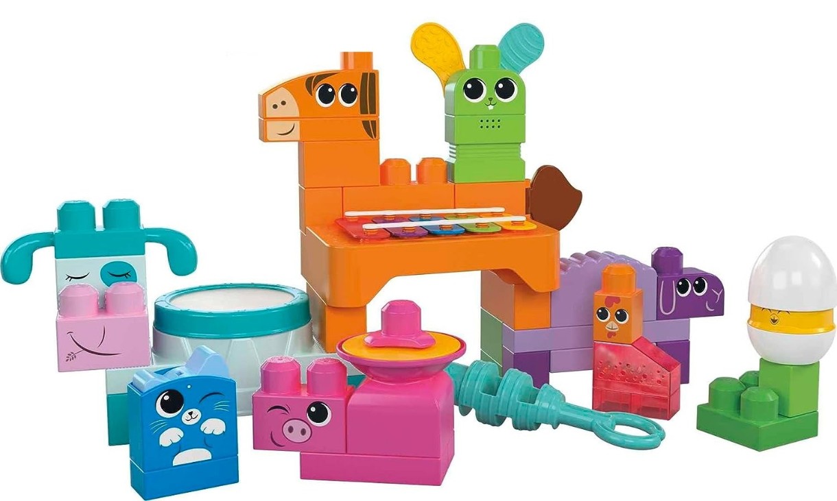 Малыши будут танцевать от радости, когда соберут музыкальную ферму с 10 сенсорными функциями. Они могут построить 8 сельскохозяйственных животных, у каждого из которых есть свои музыкальные особенности: ксилофон для лошади, барабан для коровы, погремушка для цыплят, тарелка для поросенка, гуиро для овец, кликер для кошек, пищалка для кроликов и кастаньеты для яиц. Затем они могут присоединиться к группе и научиться играть 6 детских песенок, которые помогут развить ритм и мелодию.