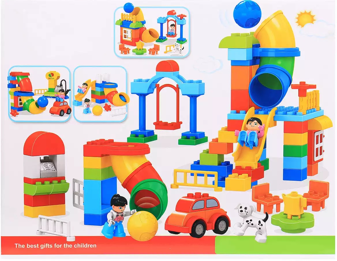 Красочный детский игровой конструктор включает в себя 100 деталей, из которых малыш сможет собрать детскую игровую площадку с двумя горками, в которые можно запустить мячики с цифрами, качелей, каруселью, заправкой с машинкой, фигурками детей, которые играют на площадке вместе с собачкой. Размер деталей крупный и даже маленьким детям будет удобно играть с таким набором. Благодаря этому набору ребёнок не только весело проведёт время, но и узнает принципы работы многих аттракционов, запомнит цвета и цифры. Элементы конструктора изготовлены из высококачественной пластмассы, надёжно соединяются между собой и разбираются без особого труда. Детали детского игрового набора упакованы вместе с подробной инструкцией в яркую коробку размером 48х37х10 см. Получить такую игрушку в подарок на праздник или день рождения будет рад любой ребенок, и мальчик, и девочка!