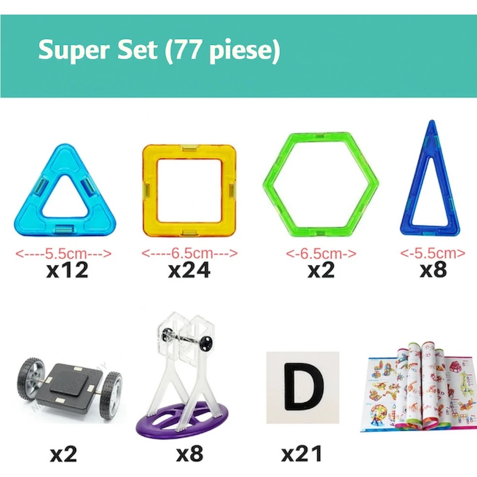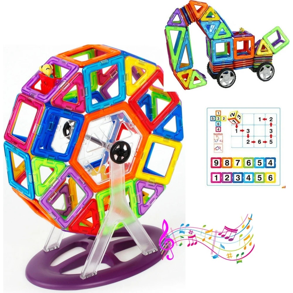 Супер-набор из 77 деталей включает лучшие элементы нашей коллекции игр, разнообразные формы, магнитные колеса, которые понравятся всем любителям машин, а также колесо обозрения с музыкой и светодиодными огнями. С этим ярким и светящимся в темноте колесом вы можете представить себя на Лондонском глазе, наслаждаясь видами города с высоты! Этот набор дополнен аксессуарами с фруктами, цифрами и математическими знаками, которые идеально подходят для работы с квадратными деталями. Родители могут использовать эти элементы, чтобы обучать детей цифрам и практиковать базовые математические операции, такие как сложение, вычитание, умножение и деление. Это отличный набор для обучения через игру. В набор входит: