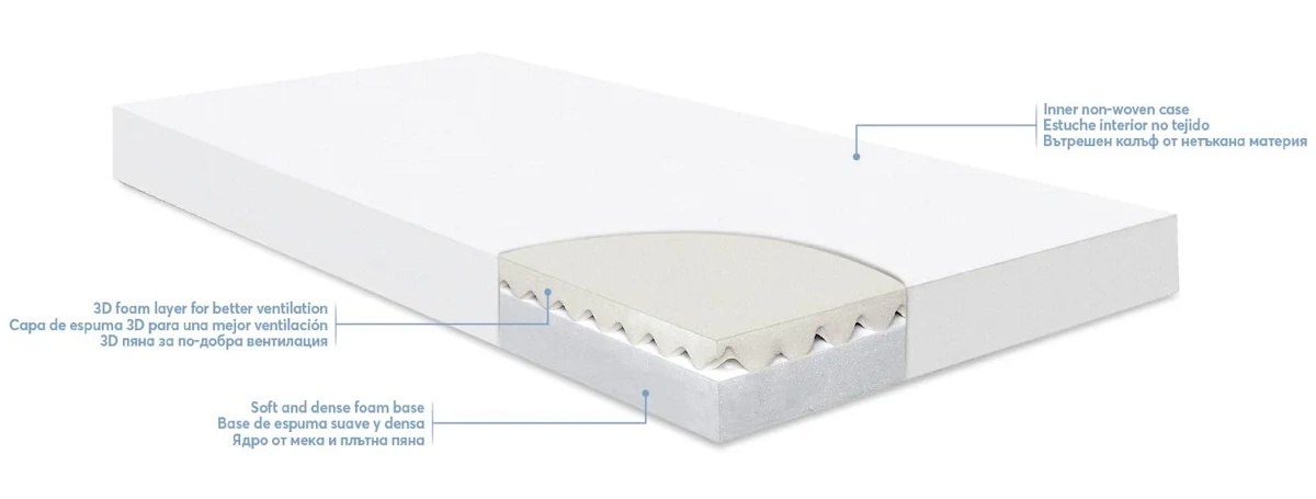 Мягкий и плотный наполнитель со слоем 3D пены для лучшей вентиляции и предотвращения удержания влаги.
