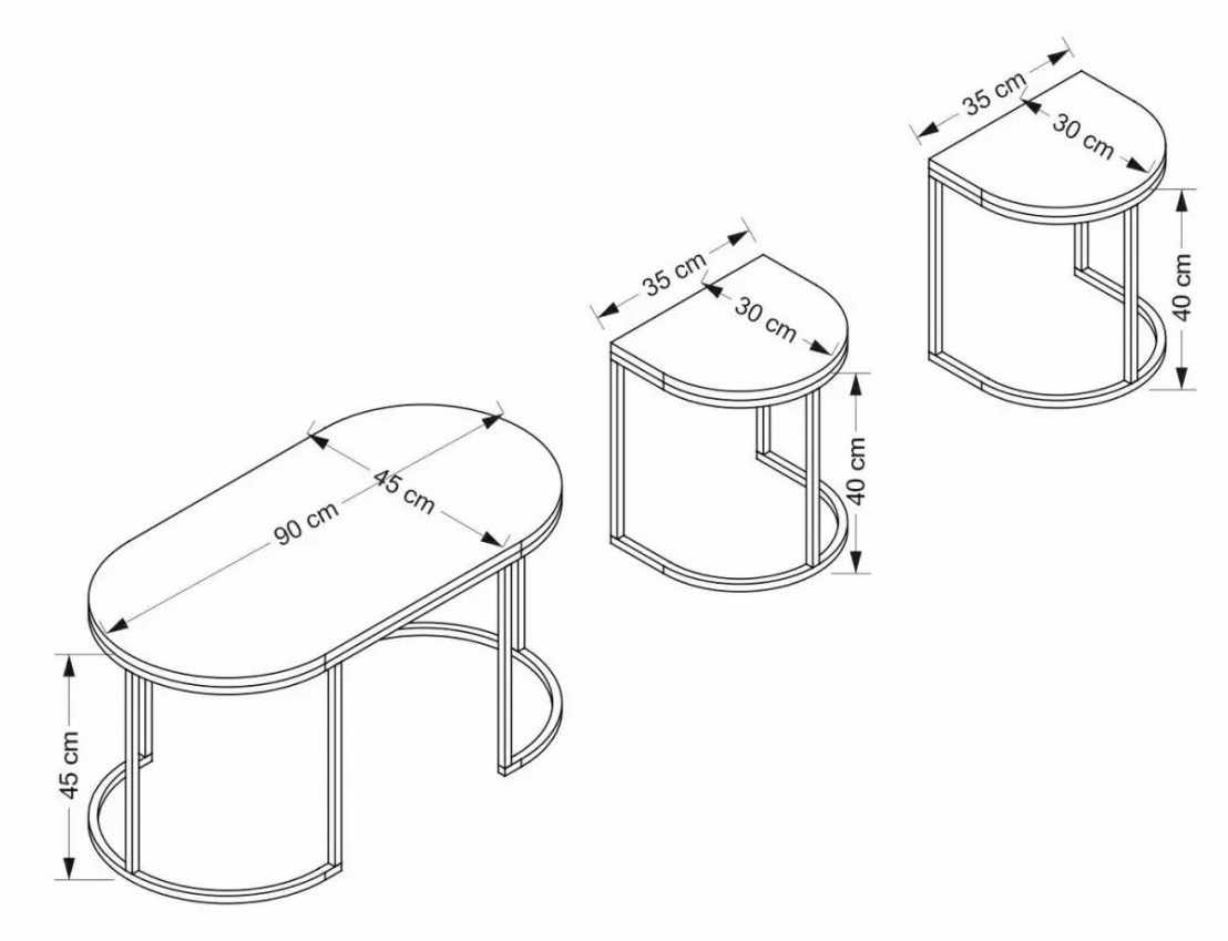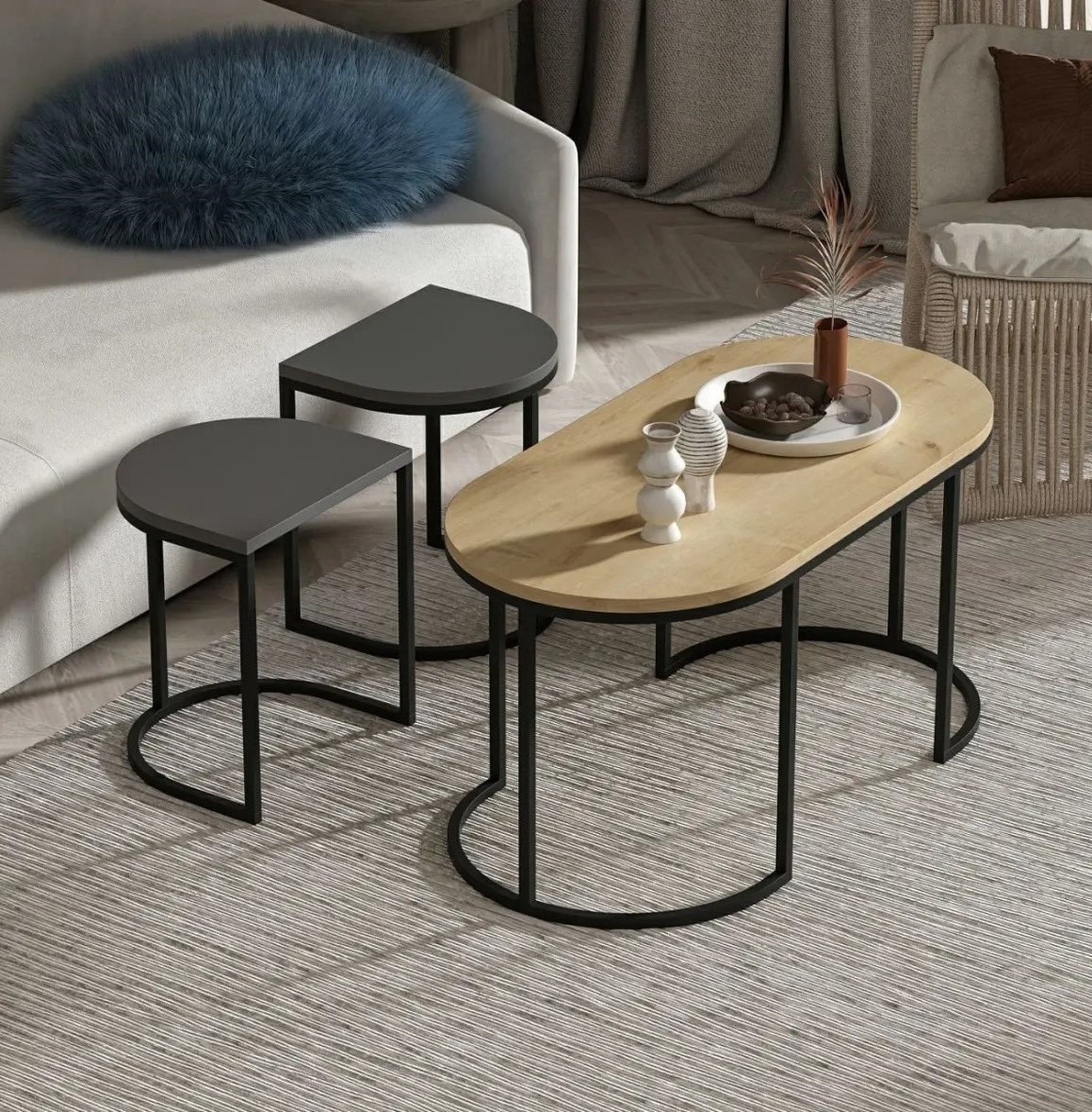 Набор включает три столика разных размеров, что позволяет расставлять их по-разному в зависимости от потребностей. Они предоставляют дополнительную поверхность для гостей или удобное место для размещения декоративных предметов.
