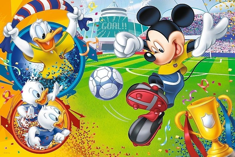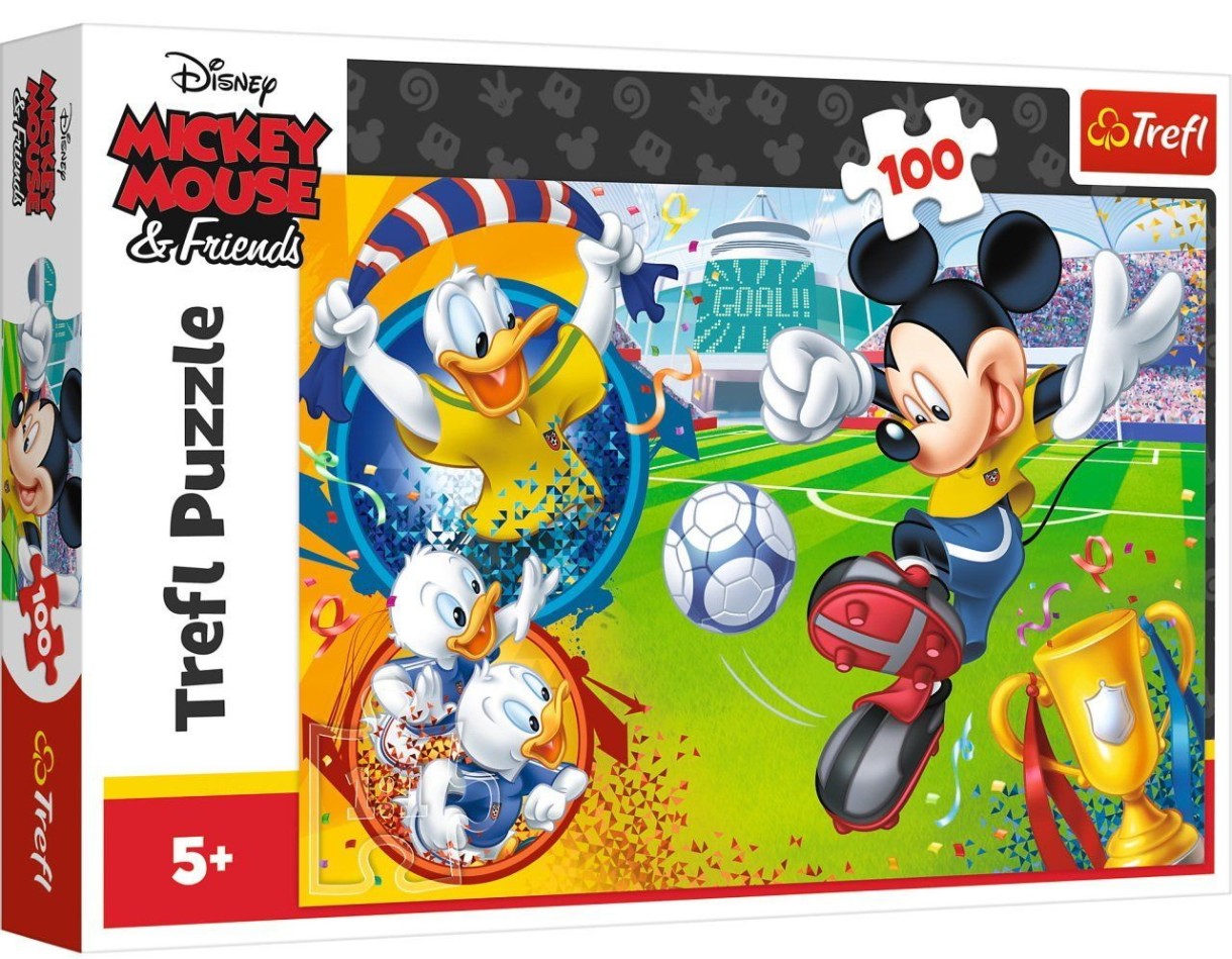 Пазлы на 100 элементов с изображением культовых персонажей мультипликационного сериала Уолта Диснея "Микки Маус и его друзья". В сложенном виде размер картинки составляет 41х28 см.