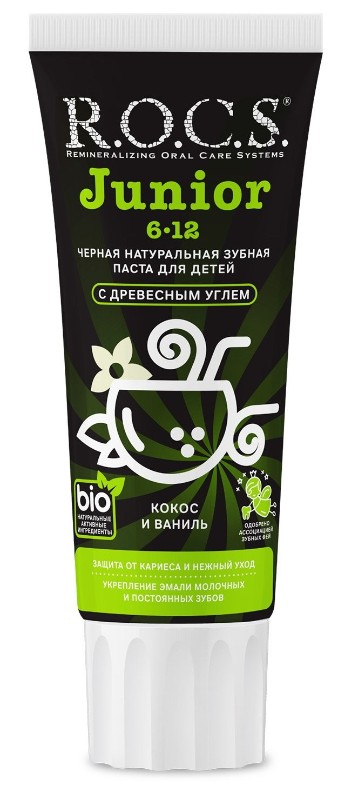 Натуральная высокоминерализованная зубная паста R.O.C.S. Junior BLACK «Кокос и Ваниль» разработана специально для детей в возрасте от 6 до 12 лет. Она содержит богатый набор полезных микроэлементов, и обеспечивает качественный уход за ротовой полостью в период смены молочных на постоянные зубы. Содержит натуральный черный древесный уголь для здоровья и естественной белизны улыбки.