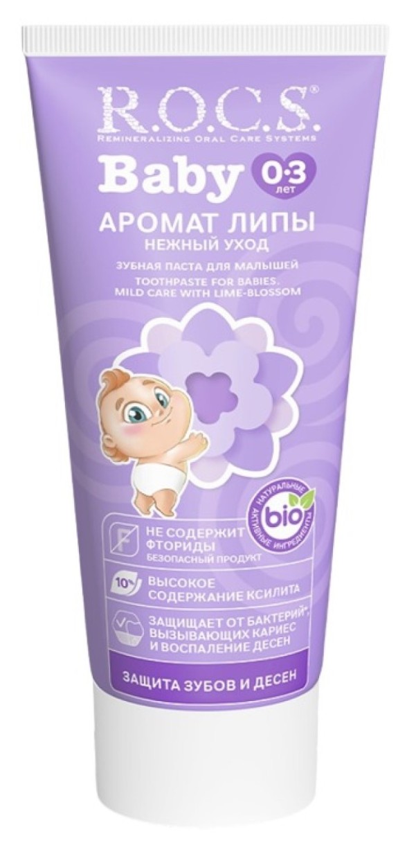 Натуральная и безопасная детская зубная паста R.O.C.S.® Baby Аромат липы защищает зубы малыша от кариеса с самого рождения. Ксилит (10%) защищает от бактерий зубного налета*, восстанавливает баланс микрофлоры полости рта. Экстракт цветков липы ухаживает за деснами в период прорезывания зубов, защищает от воспаления. Приятный вкус любимой детской каши для гигиены с удовольствием. Гипоаллергенный продукт.*