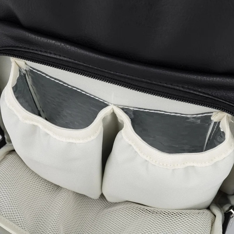 Рюкзак имеет двенадцать функциональных карманов, включая специальный карман для планшета или влажных салфеток, термоизолированный карман, водонепроницаемый карман для мокрых вещей и место для бутылок и ключей.