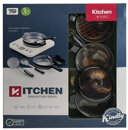 Кухонный набор, который включает в себя: 2 кастрюли, 2 сковороды, газ, набор столовых приборов. Изделию не нужны батарейки. Игрушка предназначена для детей старше 3 лет.