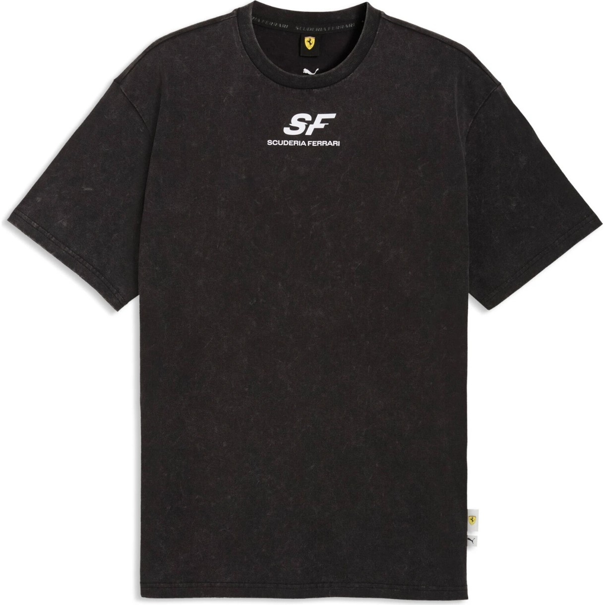 Эластичный круглый вырез в рубчик аккуратно прилегает к шее и сохраняет посадку даже после многократных стирок. На груди размещён логотип Scuderia Ferrari, подчёркивающий принадлежность к легендарной гоночной команде.