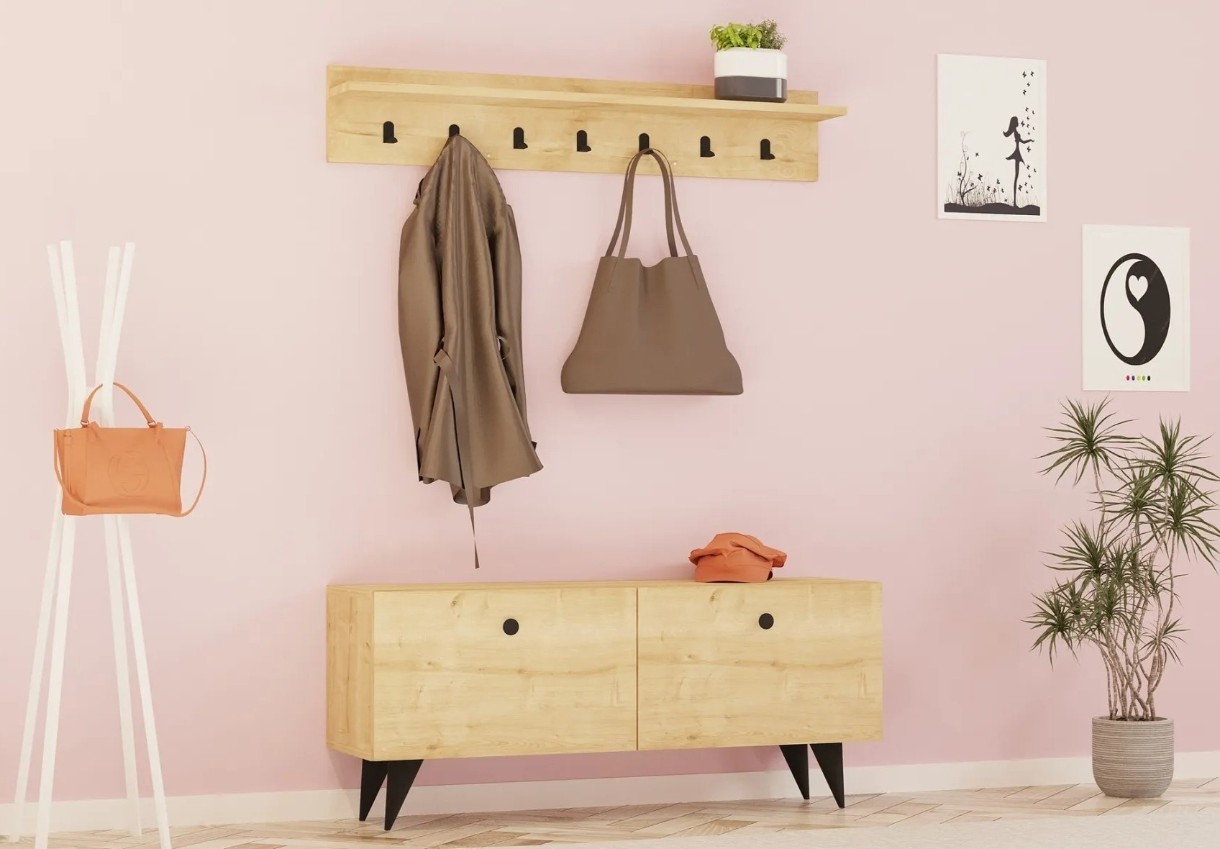 Многочисленные полки и удобная зона для развешивания вещей обеспечивают достаточно места для хранения необходимых предметов. Ключи, письма, шапки и шарфы будут аккуратно размещены и легко доступны. Дополнительная настенная полка позволяет разместить предметы декора, создавая больше пространства и удобства.