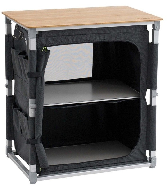 Outwell Padres Storage Unit сочетает функциональность и стильный дизайн. Солидная бамбуковая столешница придаёт помещению элегантность. Для удобства использования с одной стороны расположены три практичных крючка, а с другой — карман для хранения. Кроме того, в шкафу есть выдвижной держатель для миски или мусорного мешка.