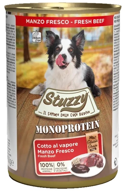 STUZZY DOG Can Monoprotein Beef 400g – это консервированный корм для собак, приготовленный из одного источника белка – говядины. Это идеальный выбор для собак с чувствительным пищеварением или склонных к аллергиям, так как продукт содержит только ягнятину в качестве основного ингредиента.