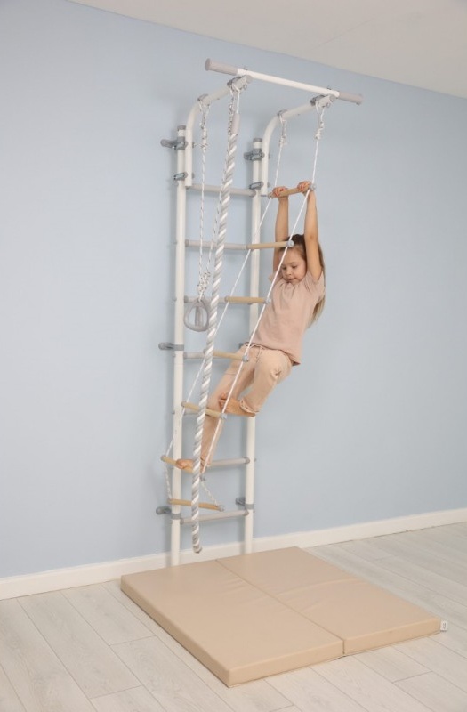 Пастельный цвет ступеней гармонично сочетается с серым корпусом, спортивный уголок стильно выглядит в любом интерьере.