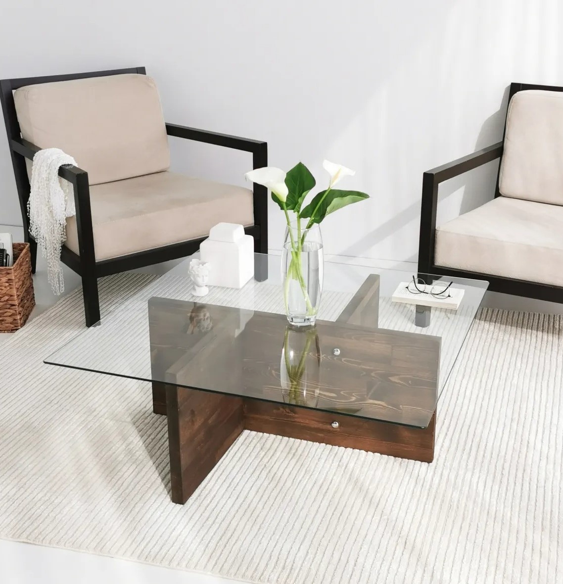Столик создан для длительной эксплуатации. Стеклянная столешница из 100% закалённого стекла не только выглядит выразительно, но и отличается высокой устойчивостью к ежедневному использованию и появлению царапин. Основание из массива сосны обеспечивает стабильность и долговечность.