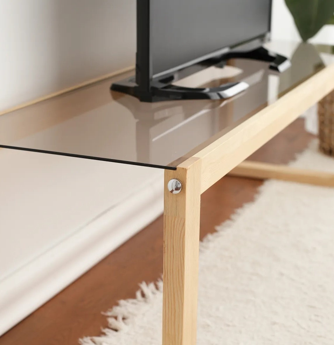 Современный дизайн тумбы под ТВ объединяет стиль и практичность. Закалённое стекло толщиной 6 мм создаёт аккуратный и изящный акцент, который легко вписывается в любое оформление гостиной.