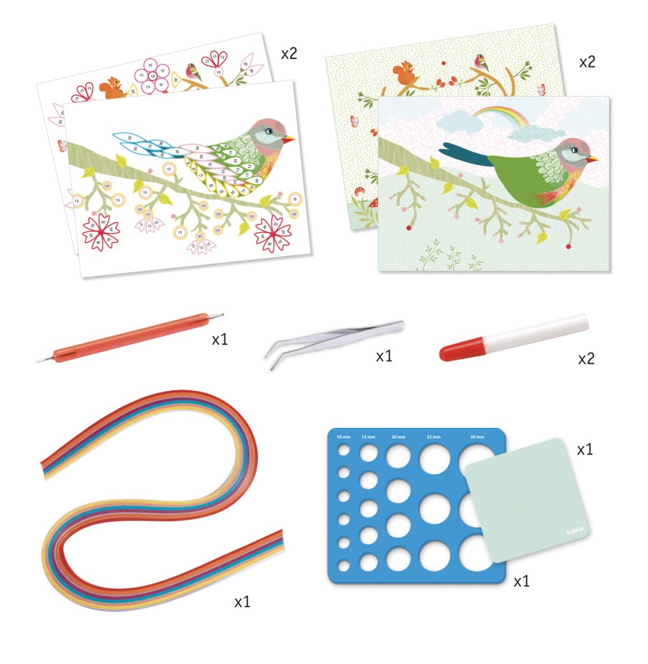 Набор для квиллинга «Птички» включает в себя 2 карточки с красивыми лесными иллюстрациями, клей, пинцет, специальный инструмент для раскатывания, тесьму, пенопластовый шаблон для создания кружков и буклет с подробной инструкцией. Используя все эти вещи, дети смогут создать трехмерные произведения искусства.