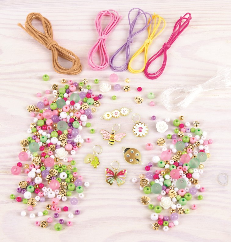 В наборе: 5 цветных вощеных шнуров (4,5 м), 1 прозрачный эластичный шнур (6 м), 447 различных бусин, 6 шарм-подвесок, украшенных кристаллами Swarovski, 1 органайзер, инструкция.