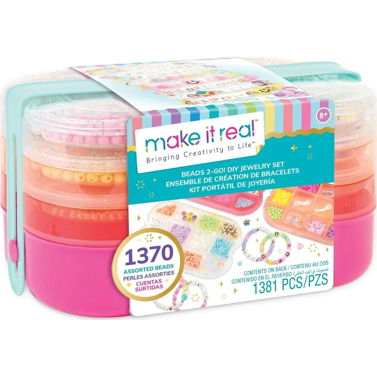Набор включает: Коробка для хранения с 4 лотками, Нейлоновые шнуры 4-х цветов (по 0,35 м), 2 прозрачных эластичных шнура (по 2,4 м), 1370 различных бусин.