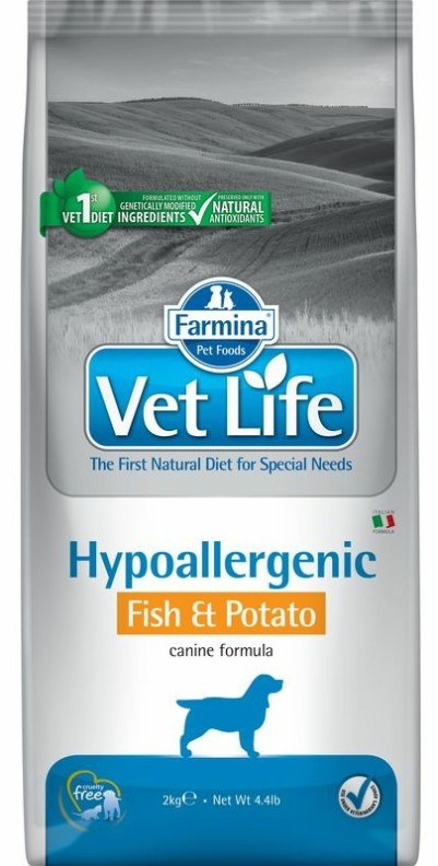 Farmina Vet Life Hypoallergenic Fish & Potato — гипоаллергенный диетический сухой корм для собак, страдающих пищевой аллергией или пищевой непереносимостью. Также рекомендован как вспомогательное средство для улучшения трофических функции кожи и ее производных.