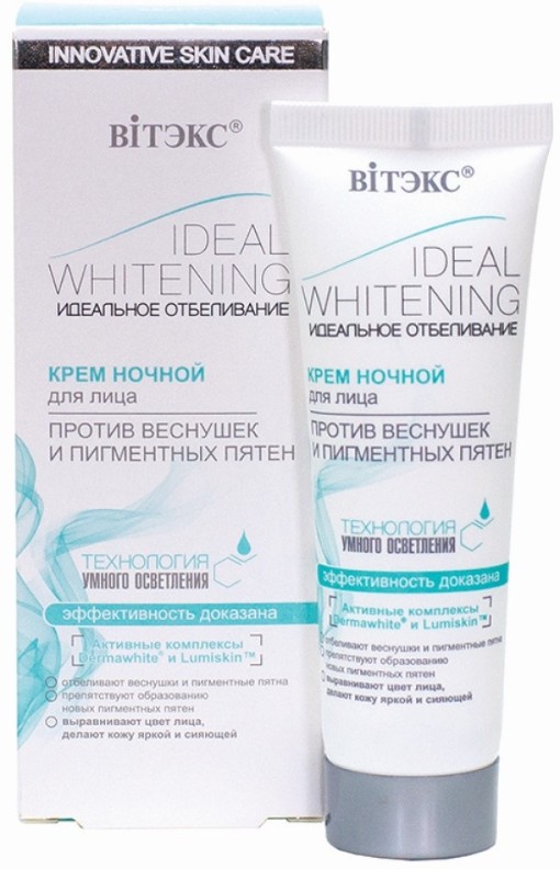 Ночной крем обеспечивает активное отбеливание веснушек и пигментных пятен на коже во время сна, когда кожа находится в состоянии покоя и наиболее восприимчива к действию активных веществ.Пока Вы спите, уникальная технология «умного» осветления кожи комплексов Dermawhite® и Lumiskin™ активно работает: происходит определение пигментированных участков, которым необходимо осветление и прицельное воздействие на них. Крем помогает снизить синтез меланина, минимизировать появление пигментных пятен и обеспечивает отбеливание кожи. Натуральный растительный экстракт толокнянки усиливает отбеливающий эффект и увлажняет кожу.