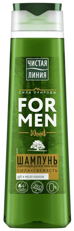 Сила природы дарит свой заряд мужчинам! Уникальный состав компонентов, основанный на отваре трав обеспечивает комплексный уход. Чистая Линия For men разработала исключительно свежий подход к уходу за телом и волосами мужчин! Энергия и сила для твоих волос активизируются благодаря силе дуба и свежести конопи. В косметологии используются ценные отвары из тонкой и гладкой коры молодых побегов, ветвей дуба и листьев. Регулярное использование шампуня для волос с экстрактом коры дуба от Чистой Линии снижает жирность кожи головы, уменьшает ломкость волос, тормозит процессы выпадения волос и придает им здоровый ухоженный вид. В конопляном масло содержится много эфиров, дубильных и смолистых веществ, витамина С. Масло конопли благотворно воздействует на состояние волос и кожи любо типа.