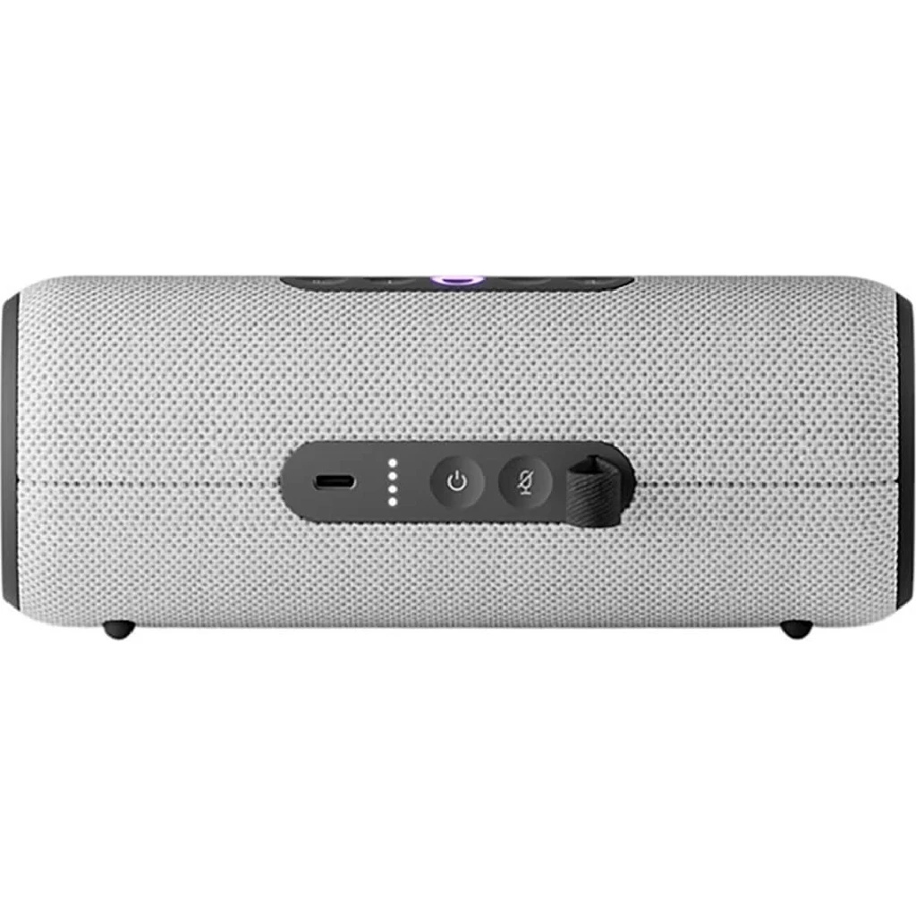 Колонка выполнена в прочном корпусе из пластика и ткани, поставляется с кабелем зарядки и карабином для крепления — удобно брать с собой в дорогу.