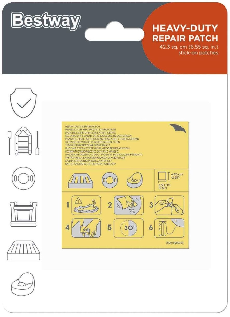 Ремонтный комплект Bestway 62068 BW — это надёжное решение для быстрого устранения проколов и повреждений на любых надувных изделиях, включая бассейны, матрасы, лодки и игрушки брендов Bestway и Intex. В комплект входят 10 самоклеящихся заплаток повышенной прочности размером 6,5×6,5 см (42,3 см² каждая), которые обеспечивают долговечное и герметичное восстановление поверхности. Процесс ремонта прост и не требует специальных инструментов: достаточно очистить участок, отделить заплатку от подложки, плотно прижать её к месту повреждения и подождать 30 минут перед повторным использованием изделия. Этот комплект станет незаменимым помощником для быстрого ремонта дома или на отдыхе.
